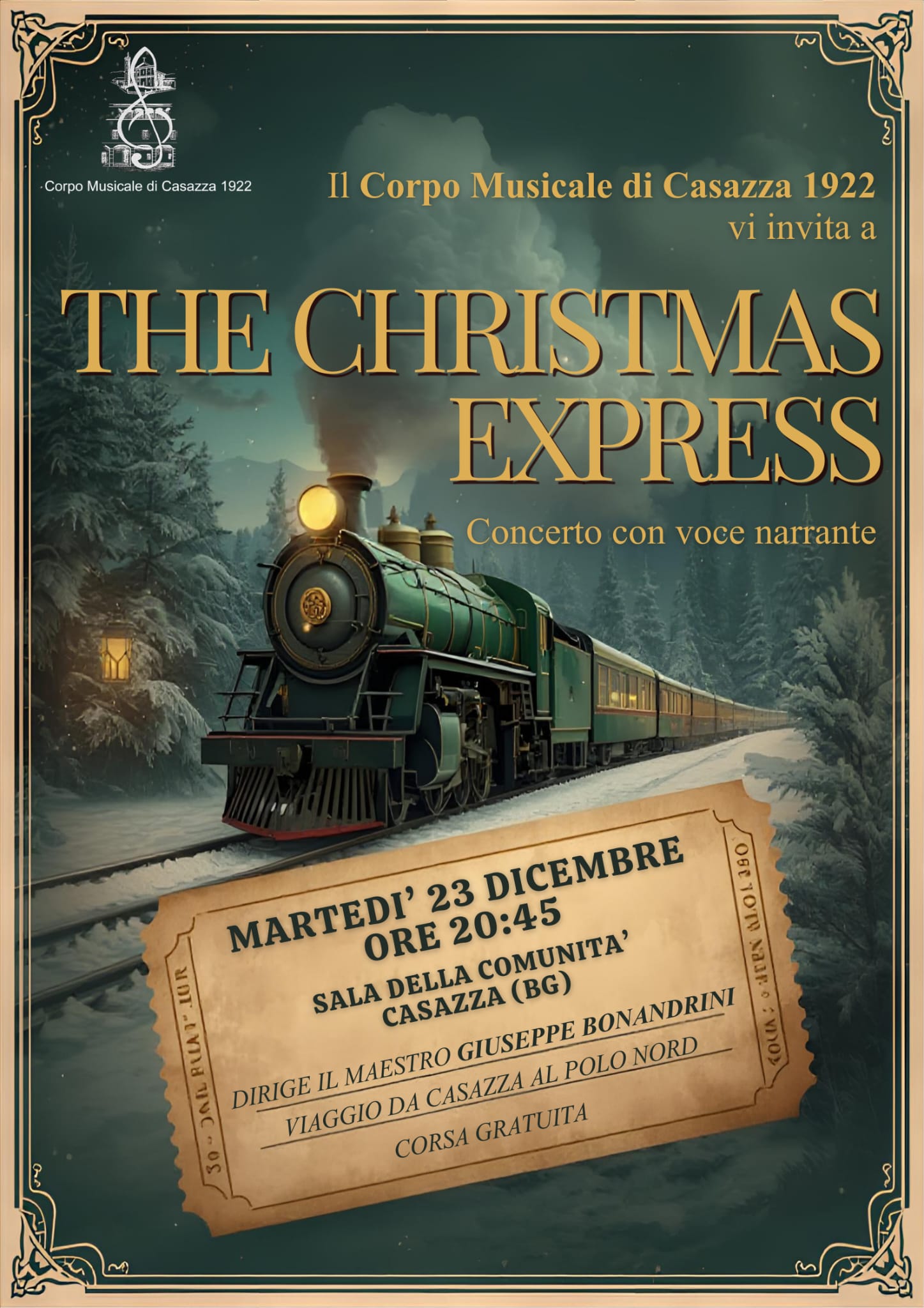 Martedì 26 dicembre con inizio alle ore 20.45 presso la Sala della Comunità di Casazza si terrà il Concerto natalizio del Corpo Musicale di Casazza 1922 dal titolo "The Christmas Express".